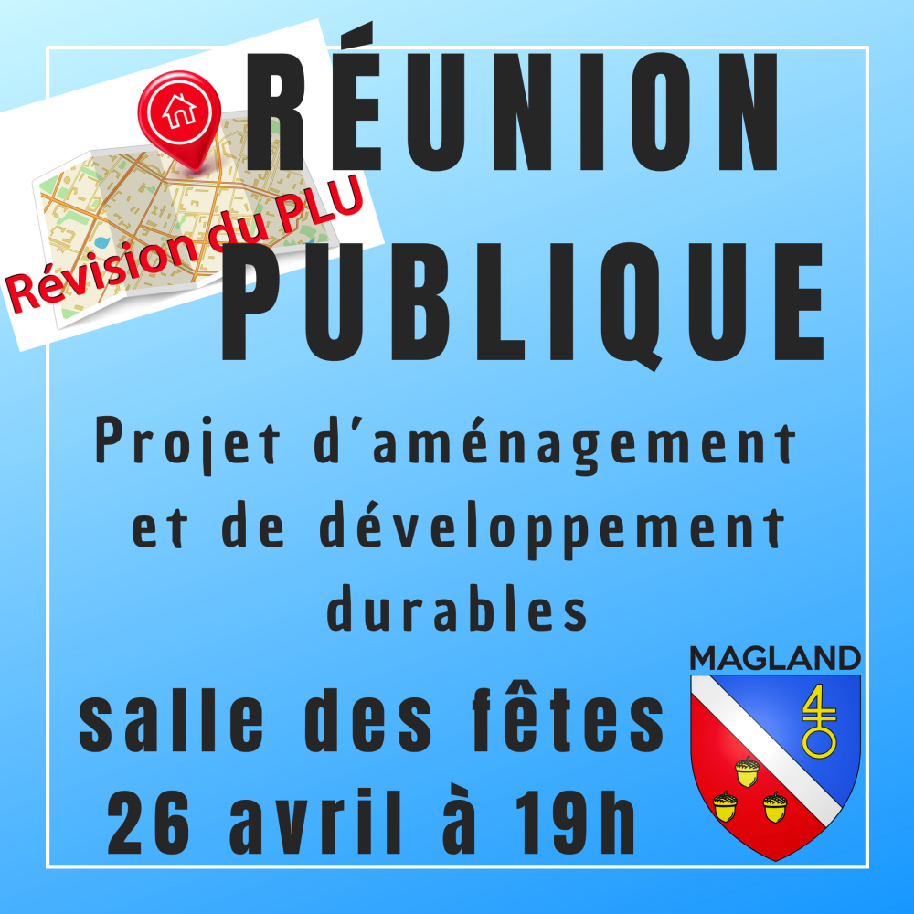 Vos élus vous invitent à une réunion publique, le mercredi 26 avril, à 19h, à la salle des fêtes, pour la 1ère étape de la révision du PLU (Plan Local d’Urbanisme) !