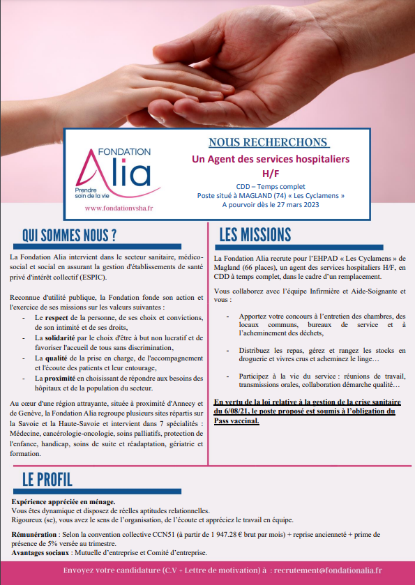 Vous êtes ici : Accueil > Nouvelle rubrique N° 187 > Offres d’emploi > Agent des services hospitaliers - EHPAD les Cyclamens